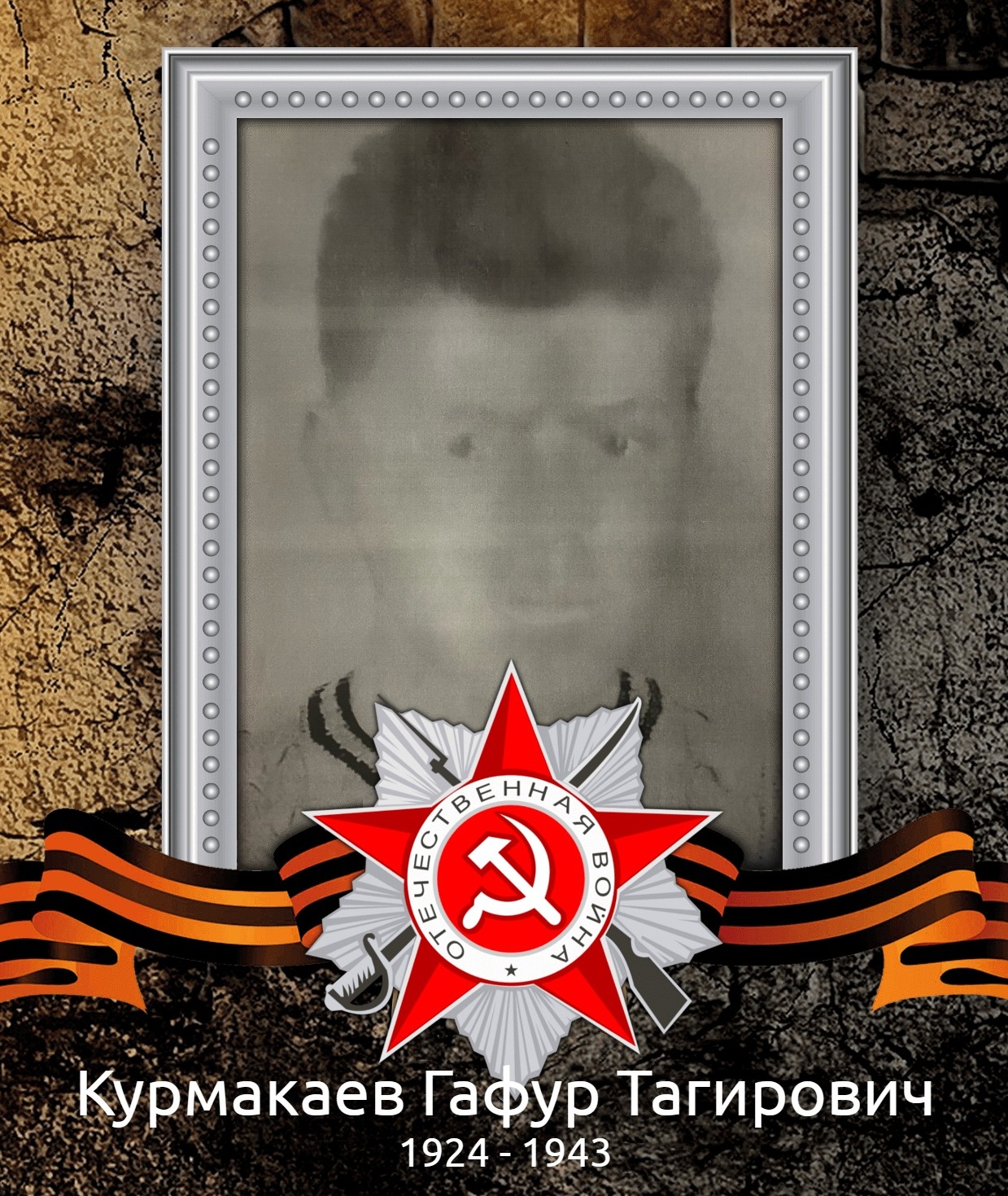 Гафур Тагирович родился в 1924 года в д. Хаджи Лямбирского района Мордовской АССР. Во время Великой Отечественной войны Гафур Тагирович был призван на службу Лямбирским районным военным комиссариатом Мордовской АССР. Служил в 738-м легком артиллерийском полку 15-й артиллерийской дивизии прорыва, где получил звание младшего сержанта. Из наградного листа: Младший сержант Гафур Курмакаев (19 лет) проявил смелость и находчивость в боях на подступах к городу Старая Русса. 13 марта 1943 года, заметив огневую точку противника, которая обстреливала наши боевые порядки, он вместе со своим расчетом выкатил орудие на открытую позицию и прямой наводкой уничтожил одну пулеметную точку и два ДЗОТа врага. В тот же день расчет Курмакаева первым открыл огонь по контратакующей пехоте противника, уничтожив до взвода его солдат. 14 марта 1943 года под огнем противника, орудие, в котором наводчиком был младший сержант Курмакаев, уничтожило два пулемета и один наблюдательный пункт врага. За проявленное мужество и отвагу в борьбе с немецкими оккупантами младший сержант Курмакаев удостоен правительственной награды орденом «Красная звезда». 28 августа 1943 года Гафур Тагирович умер в госпитале 451-й отдельной дивизии и был похоронен в деревне Березовка Подбужского района Орловской области. ![]() |